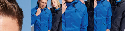 Polyester outer with PVC coating. Polyester padding and lining. Showerproof and windproof. Concealed detachable hood with adjusters. Fleece lined collar. Full length zip with stud and tear release storm flap. Inner pocket. Two front pockets. Tear release adjustable cuffs. Tear out label. Access for decoration.