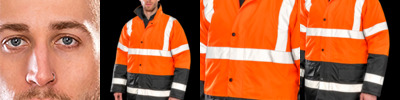 300D PU coated oxford polyester outer. Polyester filling and quilted lining. Conforms to EN ISO 20471: 2013 + A1: 2016 class 3, EN343: class 3.1. RIS-3279-TOM (orange only). Waterproof with taped seams. Windproof. Stand up collar. Concealed hood with drawcord. Full length heavy duty two way zip with studded storm flap. Two reflective bands around the body, sleeves and one over each shoulder. Two front pockets with storm flaps. Inner pocket. Tag free. Access for decoration.
