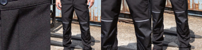 Three layer bonded soft shell. Polyester outer layer with mechanical stretch. Waterproof 8000mm, breathable 3000g and windproof TPU mid-layer membrane. Polyester inner layer. Expandable waistband with belt loops. YKK zip fly with button over. Two side pockets. Rear pockets with tear release closure, right with flap. Rubber tear release pocket trim. Left thigh multi-use cargo pocket with zip. Ruler pocket. Hammer loop. Toughened articulated knee panels. Toughened ankle scuff panel. Reinforced hem panel. Reflective detail. Triple stitched seams. Critical stress point bar tacking.