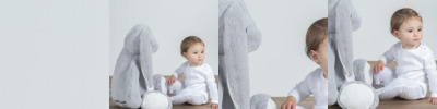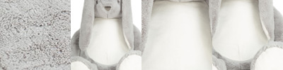 100% polyester. Soft plush grey bunny. Floppy ears. Sewn eyes and nose. White panels under ears, on tummy and feet. Removable inner pad (body only). Zip access for decoration onto front panel. Suitable for embroidery, print and sublimation.