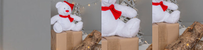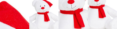 100% polyester. Soft plush white bear. Christmas hat over one ear. Sewn eyes. Red nose. Red knitted scarf. White coloured panel on tummy. Removable inner pad. Zip access for decoration onto front panel. Suitable for embroidery, print and sublimation.