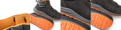 CE EN 20345:2011 S3 SRC. Anti-static. Water-resistant. Composite midsole for underfoot protection. Padded ankle support (PU leather outer). Energy absorption heel. SRC slip resistance. Composite toecap. Mesh-lined. Oil-resistant. Heel loop. Unisex injection shoe mould.