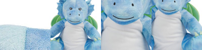 100% polyester. Soft plush blue dragon. Contrast wings and claws. Sewn eyes and mouth. White colour panel on tummy. Removeable inner pad. Zip access for decoration onto front panel. Suitable for embroidery, print and sublimation.