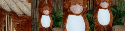 Soft plush Zippie orangutan with contrast face, hands, and feet. Sewn eyes and mouth. White panel on tummy, perfect for decoration. Zip access on base for direct access onto the tummy for decoration. Fully removable stuffing, including headpiece. Can be embroidered, vinyl and sublimation printed. Complies with EN71 European Toy Safety regulations. Remove all hang tags and their fasteners before giving this item to a child. Suitable for all ages.