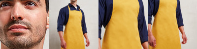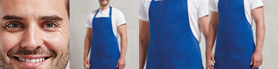 Classic premier bib apron with pocket. Self fabric neck, self fabric ties 90cm long. Sliding adjusting buckle. 60ºC wash. Size One Size