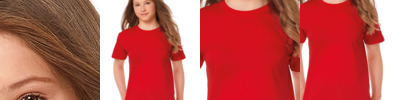 Feminine fit. Self fabric neckline. Contrast taped neck on colors & matching taped neck on white. Twin needle finishing.