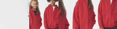 Soft cotton faced fabric. Brushed back fleece. Double fabric hood. No drawcord to comply with EU regulations. Full length covered zip. Front pouch pockets. Heather grey 75% ringspun cotton/25% polyester. 410g