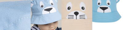 Kids bucket hat with embroidered character facial features. Two colourways in different animal styles. Top-stitched brim detail. Flat top. Elasticated back. Suitable for decoration.