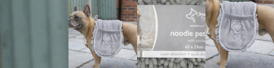 Noodle design microfibre pet towel with pockets. Soft, super-absorbent and quick-drying material. Size: 63 x 23cm.
