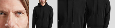 Double fabric hood. Self-coloured flat drawcord. Single jersey back neck tape. Front pouch pocket. Waist and cuff in cotton/Elastane rib.