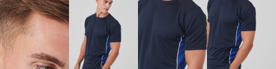 Crew neck t-shirt with raglan sleeves. 100% Polyester Wicking Coolplus fabric. Contrast side panel and piping.