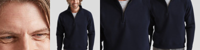 Cadet collar with single jersey back neck tape. Covered zip for enhanced printability. Two welt front pockets. Waist and cuff in cotton/Elastane rib.