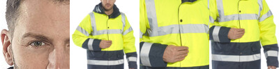Conforms to EN ISO20471:2013 Class 3 and EN343:2003 + A1:2007 Class 3.1 against foul weather; Hi Vis Orange/Navy conforms to RIS-3279-TOM; Waterproof PU coated 300D Polyester with 190gsm quilted padding and Nylon lining; Two 5cm 3M reflective tapes around the body and arms, and one over each shoulder; Navy contrast helps to provide a corporate image and hide scuff marks; Heavy duty zip under the studded storm flap; Two outer pockets with storm flaps; Knitted storm-cuffs in the sleeve ends; Concealed hood with draw cord; Inside breast pocket; Stitched and taped seams to ensure waterproof; Matching trousers, codes HVS461 and HVS462 and HVS463.