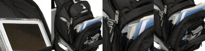 An athletic style with a huge centre compartment and plenty of wellplaced pockets keeping active executives ready for anything. Back panel side entry padded laptop sleeve. Front vertical file organiser. Large storage area. Travel essentials sleeve. Power cord and mouse storage. Four large exterior pockets. Neoprene top grab handle. Weatherproof fleece-lined audio pocket with headphone exit port. Sliding sternum strap. Deluxe organiser panel. Heavy duty reinforcements. SIZE One size: 19" x 14" x 10" Laptop sleeve: 16" x 11.5" x 2" Fits most 17" laptops