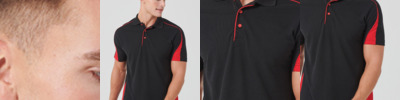 65% polyester/35% cotton. Contrast taped neck and side vents. Three button placket with contrast piping and buttons. Contrast piping and panels on sleeves. Contrast side panels. Twin needle stitching.