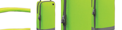 600D/420D polyester combination. Water resistant fabric. Wipe clean interior. Grab handle. Rear mesh pocket. Authentic metal ventilation eyelet. Capacity 8 litres.