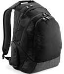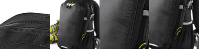 600D/420D polyester combination. Water resistant fabric. Grab handle. Padded adjustable shoulder straps. Compression straps. Padded back panel. Padded laptop compartment compatible up to 15.6". Dual compartments. Wet pocket. Organiser section. Elasticated bottle loop. Media pocket and headphone port. Metal ventilation eyelets. Tear out label. Capacity 18 litres.
