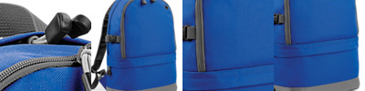 600D polyester. Self fabric carry handles. Detachable adjustable shoulder strap. Main zip compartment. Front zip pocket. Internal mesh pocket. Internal baseboard. Contrast piping. Capacity 15 litres.