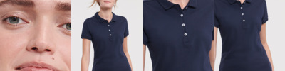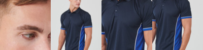 100% textured polyester. Moisture wicking fabric. Quick drying. Shaped fit. Shorter collar. Three button placket. Bound cuffs. Contrast side panels and white piping. Twin needle hem.