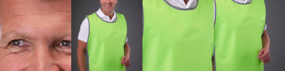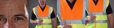Tear release front closure. Bound edges - solid colours have self colour two tone have contrast. Two reflective bands around the body and one over each shoulder.