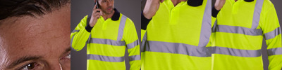 100% polyester. Conforms to EN ISO 20471: 2013 + A1: 2016 class 2. RIS-3279-TOM (orange only). Contrast knitted navy collar and cuffs. Three button placket. Two reflective bands around the body and one over each shoulder. Twin needle stitching.