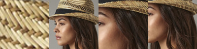 100% natural straw. Polyester sweatband. Hand made. Tear out label.