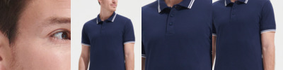 100% ringspun cotton.* Fitted style. Ribbed collar and cuffs with contrast double stripe tipping. Taped neck. Three self colour button placket. Side vents. Twin needle hem.
