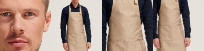 65% polyester/35% cotton. Self fabric neckband. Anti-tangle ties. Single front pocket. Width 71cm. Length 91cm. Industrial or domestic wash 65°C. Branded tab on left.