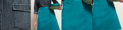 65% polyester/35% cotton twill. Easy care fabric. Long continental style. Single pocket combining pen pocket - tablet friendly. Self fabric 90cm ties. Width 90cm. Length 80cm. Industrial laundry 85°C. Domestic wash 60°C.