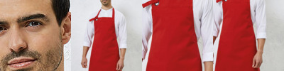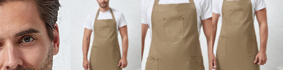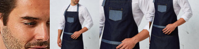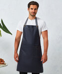 A full bib apron with style features taken from the popular 'chino' style. A stitched patch pocket with rivets features at the centre top and two side pockets big enough to carry tablet devices sit just below waist height. The neck strap is loose and the wearer can loop the end through the buckle and use the pop-snap buttons to fasten in place.
