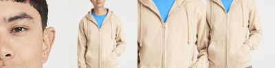 Full zip hoodie with a covered main zip. Self fabric with twin needle stitching detailing and double fabric hood with self coloured cords and kangaroo pouch pocket. Right hand side pocket has small hidden opening for ear phone cord feed and hidden ear phone loops. Ribbed cuff and hem and self coloured twill tape puller. Also available in kids'