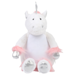 Soft plush unicorn. Contrast silver feet and horn. Sewn nose and eyes. Contrast mane tail and trim. Removable inner pad. Zip access for decoration onto front panel.
