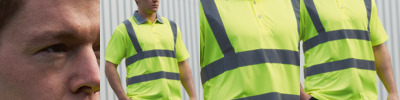 100% polyester. Conforms to EN ISO 20471: 2013 + A1: 2016 class 2. ANSI/ISEA 107 class 2.2. UPF 35+. Grey collar with yellow tipping. Two reflective bands around the body and one over each shoulder. Side vents. Twin needle stitching.