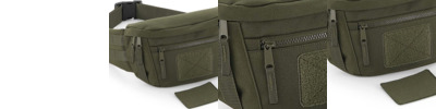 600D polyester. Military inspired design. Adjustable webbing belt with secure clip closure. Main zip compartment. Front zip pocket. Interchangeable Rip-Strip™ patch designed for decoration. MOLLE webbing loop detail. Tear out label. Capacity 3 litres. Compatible with MOLLE utility patch, BG840 and MOLLE sublimation patch, BG841.