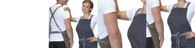 65% polyester/35% cotton. Contrast grey neckband and thick webbing cross back ties. Large front pocket. Width 71cm. Length 91cm. Domestic wash 60°C.