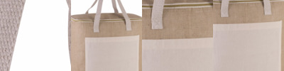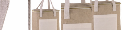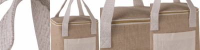 Jute canvas/cotton. Cotton carry handles. Aluminium lining and high density insulating foam. Front pocket for easy decoration access. Capacity 12 litres.