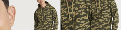 Soft cotton faced fabric. Brushed back fleece. Drop shoulder style. Double fabric hood with flat lace drawcord. Front pouch pocket. Ribbed cuffs and hem.