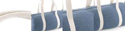 100% soft cotton denim. Grab handle/hanging loops. Cotton webbing carry handles. Drawcord closure. Tear out label. Capacity 12 litres.