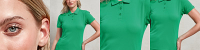 Double piqué knit. Coolplus® wicking yarn. Easy care fabric. Quick dry. Antimicrobial fabric treatment. Snag crease and shrink resistant.