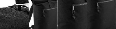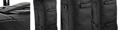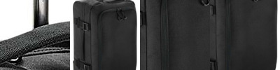 600D polyester. Aircraft cabin compatible. Padded grab handles. Foldaway backpack shoulder straps. Dual compartment design. Dual compression straps. Lockable main zip compartment. Quick access top zip pocket. Large front zip compartment with internal mesh divider. Internal zip pocket. Organiser section. Padded laptop sleeve compatible up to 15.6". Tear out label. Capacity 40 litres.