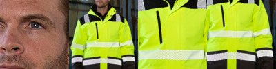 Two layer mechanical yarn bonded soft shell. Polyester outer, in transition to using recycled polyester. Waterproof 8000mm, breathable 3000g and windproof TPU mid-layer membrane. Polyester filling and quilted lining. Conforms to EN ISO 20471: 2013 + A1: 2016 class 2. RIS-3279-TOM (orange only). Taped seams. Stand up collar. Concealed adjustable hood. Hanging loop. Full length zip with tear release and studded storm flap. Two reflective printed bands around the body, sleeves and one on each shoulder. Right chest zip pocket. Two front pockets. Inner pocket. Black contrast shoulders, lower sleeves and body. Tear release and part elasticated cuffs. Tag free. Access for decoration on left chest and hem.