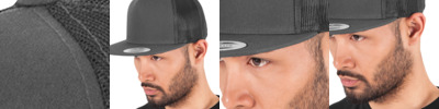 60% cotton/40% polyester. Polyester mesh rear panels. 5 panel. High profile. Stitched eyelets. Foam front panel. Flat peak. Plastic snapback size adjuster. Authentic visor sticker.