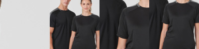 100% polyester. Single jersey. Wicking finish keeps you dry and comfortable. Raglan sleeves. Taped neck. Contrast back collar, shoulder and sleeve panels. Twin needle cuffs and hem. Tear out label.
