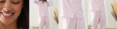 95% polyester/5% elastane. Shirt with notched collar. Self colour pearlised plastic buttons. Contrast piping around collar and centre front opening. Self fabric cuffs with contrast piping. Trousers have elasticated waistband with mock white drawcord. Contrast piping on leg ends. Twin needle hems. Tag free.