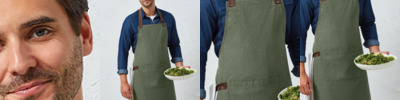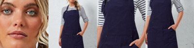 100% cotton yarn dyed oxford. Faux leather adjustable neckband with rivet detail. Tablet friendly front pocket with pen pocket. Faux leather cloth holder and side tabs with rivet detail. Self fabric ties with double D-ring. Width 72cm. Length 86cm. Domestic wash 60°C.