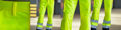 Yellow/navy and orange/navy conform to EN ISO 20471: 2013 + A1: 2016 class 1. RIS-3279-TOM (orange/navy only). Navy provides enhanced visibility. Water repellent finish. Part elasticated waistband with belt loops. Zip fly with button over.