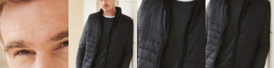 100% nylon pongee outer. Polyester padding. Shower resistant. Topstitched quilting. No quilted stitching on chest and top of back. Stand up collar. Full length zip with non-slip puller. Bound armholes. Plain side panels. Inner pocket. Two front concealed zip pockets. Cut out label.