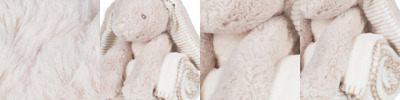 100% polyester. Soft plush light brown rabbit. Contrast cream corduroy under ears and on paws. Tear release fastening on paws. Separate cream fleece blanket with contrast blanket stitched edge (90 x 75cm). Comes in a presentation bag with cream ribbon.