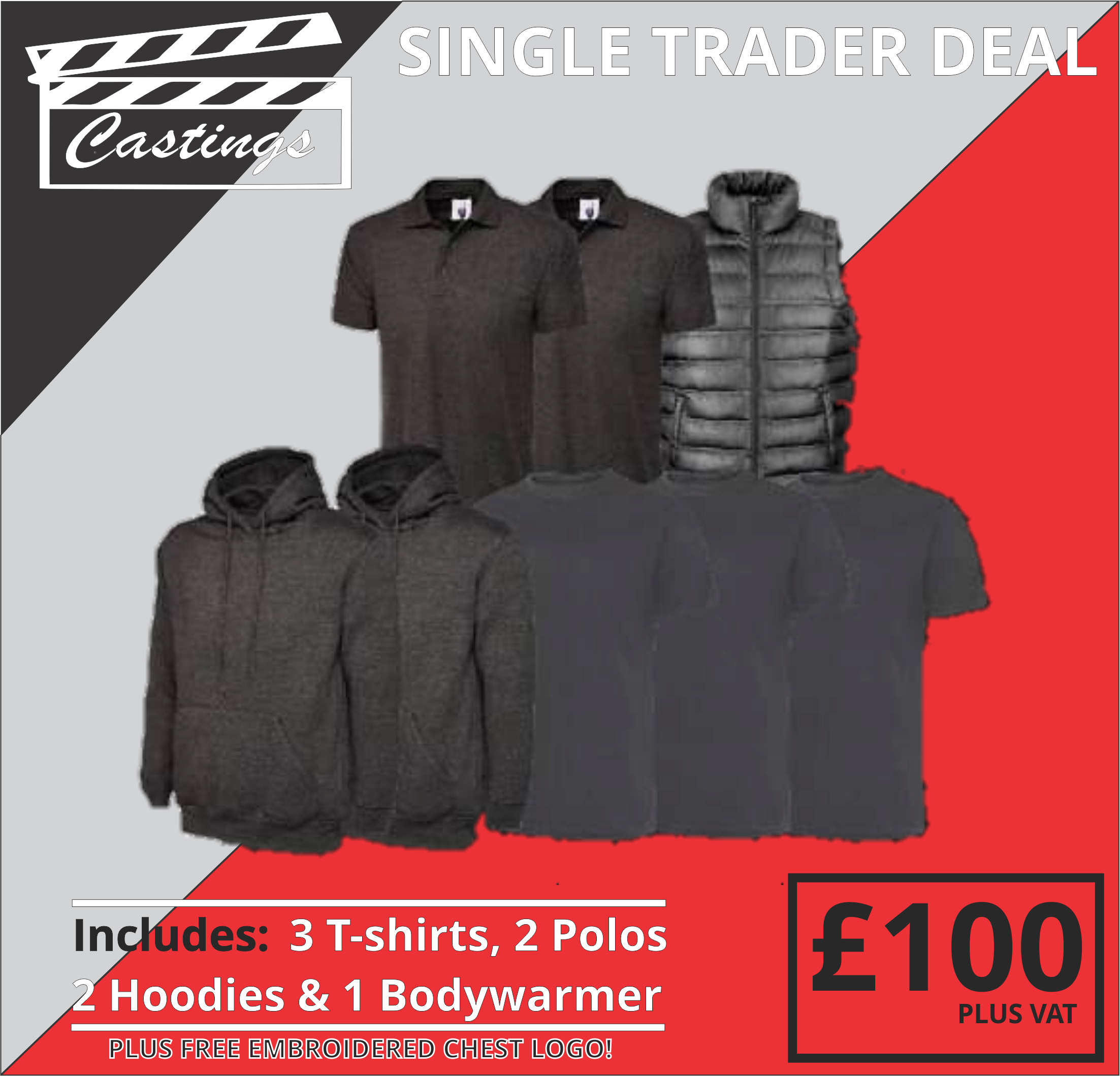 The single trader deal is perfect to kit out one member of staff, you get all the below for £100+VAT with a Left Chest Embroidered logo free.