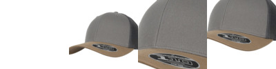 Two-tone, unipanel trucker cap with Flexfit technology, polyester mesh, mottled front, seamless front, pre-curved, and eightfold quilted visor.